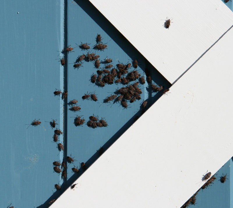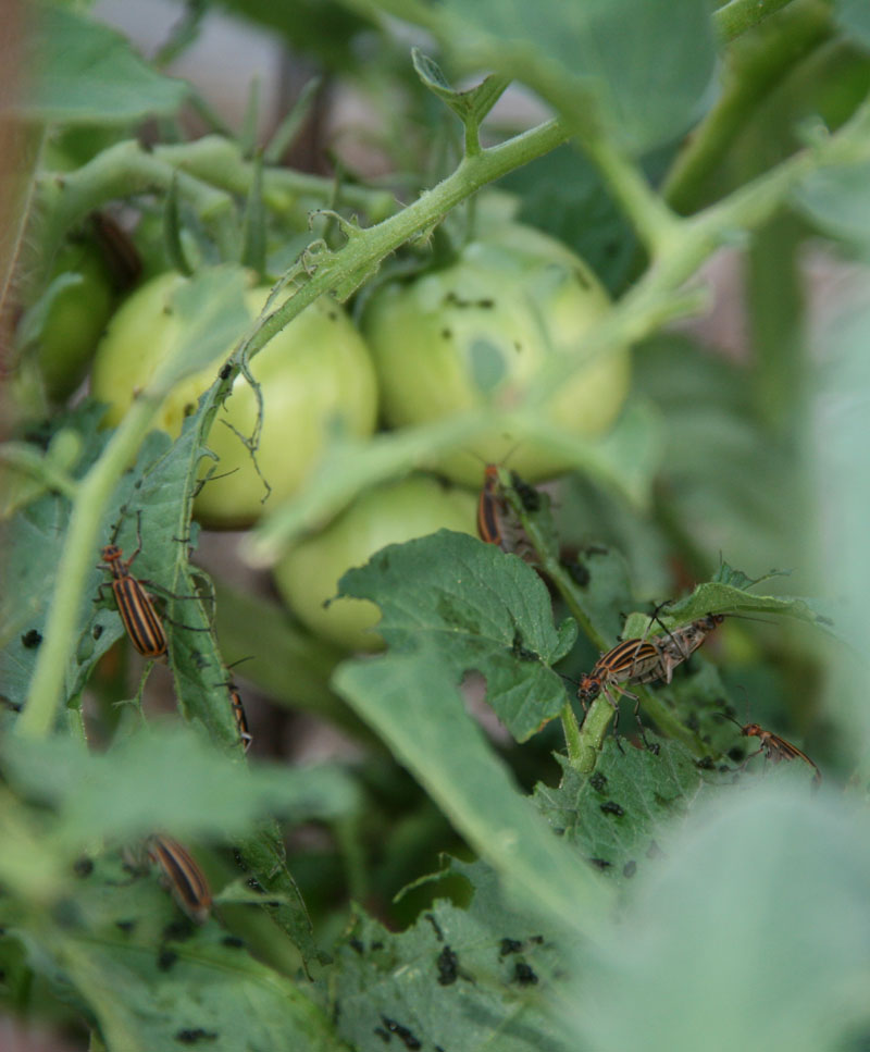 One morning in June, I noticed the tomatoes being rapidly decimated by bugs. I broke out the sevin which did the trick. I found out that they are striped blister beetles, also sometimes called potato bugs. Apparently, they can cause blistering on the skin if handled. Fortunately, I didn't touch them. It's not like I go around touching bugs as a rule. As usual, the squash was attacked by squash bugs, which is just what I do to control them--squash them--but it is a full-time job.