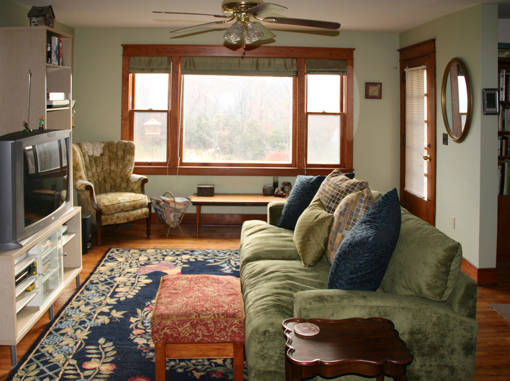 After refinishing the living room/dining room floors last year, I finally completed my vision of decorating with a new sofa. I have been wanting a green sofa to match the color scheme but couldn't justify the expense. However, our existing sofa obliged by falling to pieces rapidly over the last year or so. The springs broke and more holes were added to the ones Buster had put in it when he was a pup. The piping fell apart and the dirt really started to show. It lasted a good 7 years. With dogs, that's not bad. A new sofa became a necessity instead of an indulgence. I ended up special ordering one since we couldn't find one that was deep and the right color. The price was right but we had to wait 2 months to get it. Now we just have to figure out how to keep the dogs off of it. Yeah, right.