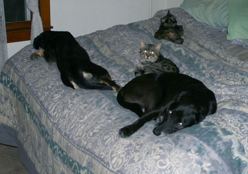 Surprisingly, (to me) Buster has had problems bonding with the new girls. Sophie and Pepper hit if off right off the bat. They play together all of the time. Buster has only just recently started playing with Sophie. She is a very good sport when Pepper and Buster attack her from all sides. Buster is still unsure about Pepper although Pepper has never shown him (or anyone) any aggression. It may just be that she is a little bit bigger than him. Danny saw them playing a bit in the living room recently so they may become friends yet.