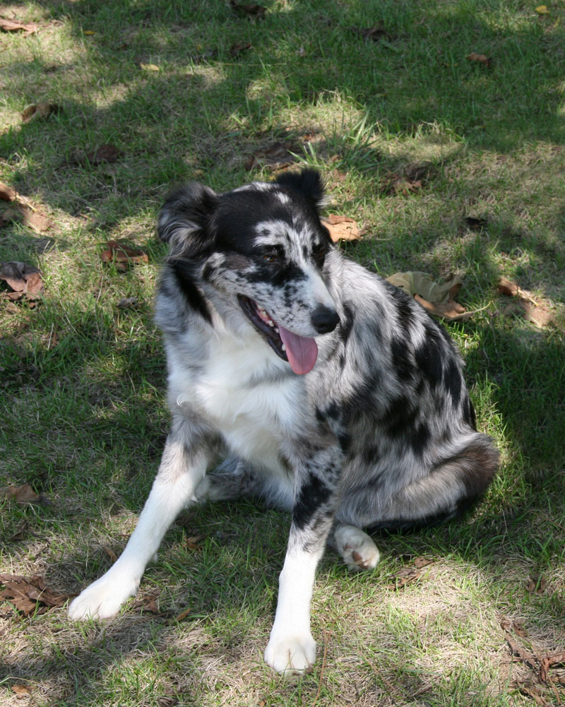 In February, I found Pepper on Craig's List. She is an Australian Shepard. The current owners had recently purchased her to use with their sheep and found that she was afraid of the sheep. The owners could tell us very little about her background. She was very timid when we got her home. She found a spot under the bed and stayed there most of the time. She was fearful of things waving around. She was petrified of the ceiling fans. She didn't know what to do when I ran or waved my hat. She was very nervous eating her food. She never barked. She seemed to be house-broken and never made a mistake, but she didn't know any commands, like sit or stay. In the 10 months we have had her, she has improved greatly. She still looks up nervously at times but she is no longer afraid of us or the fans. She plays happily with Sophie. She comes when called. It is so cute when she wags her tail, which she didn't do much of when we got her. She has to wiggle her entire butt because her tail is so short. She still sleeps under the bed.