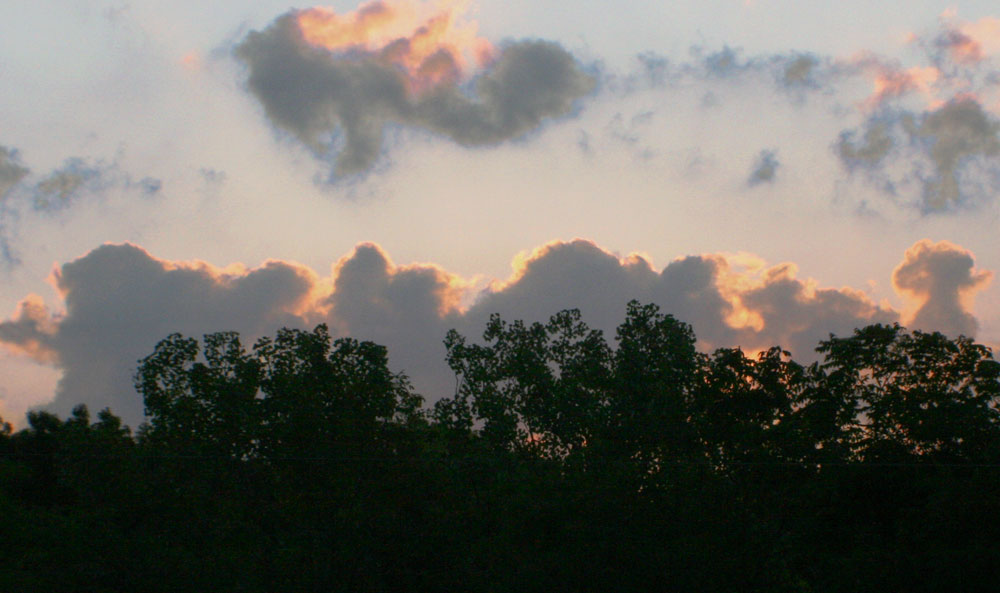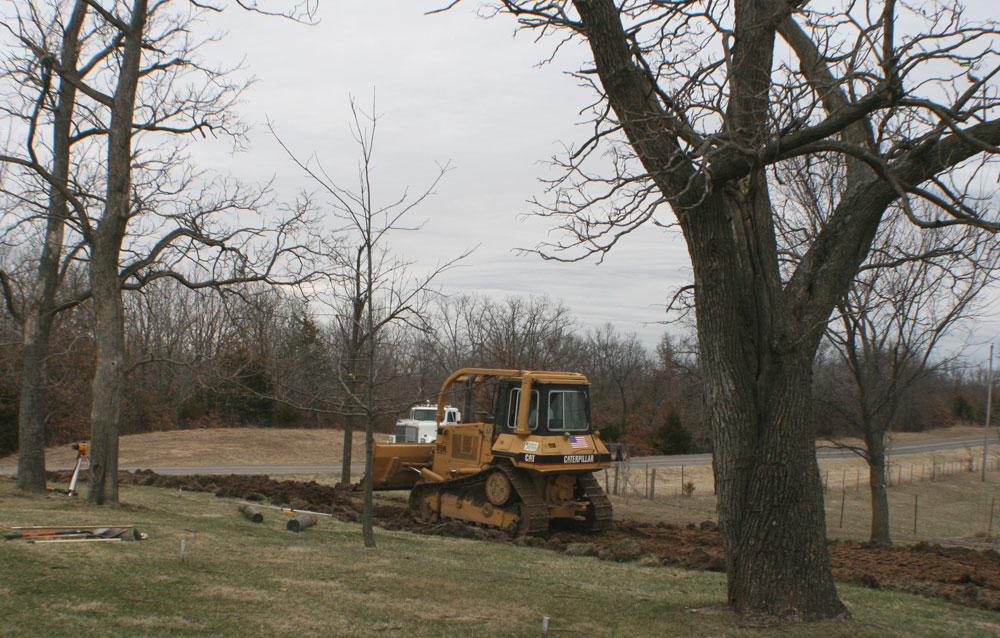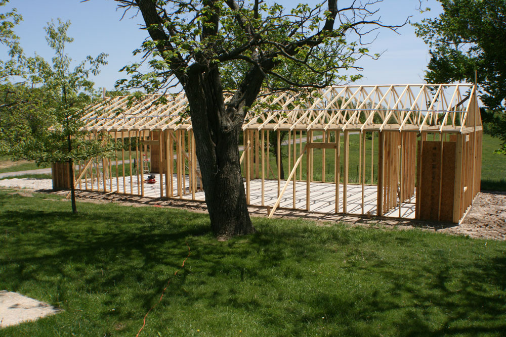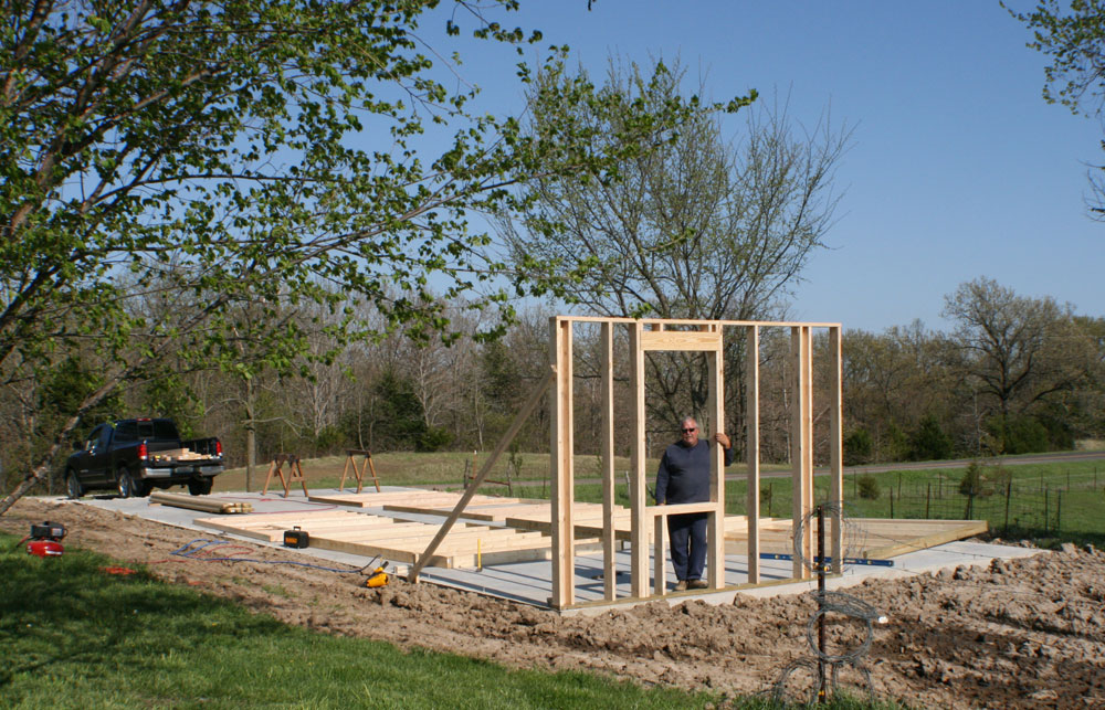 to them. :: WEATHER July was pretty wet around here. We had about of week of rain everyday. We walked down the gravel road north of our property after one of the earlier rainstorms to see the creek. The road, bridge and the bottomland was all under water. It probably was impassable for at least the entire day. It was a hot and humid day. Buster and Sammy had a nice swim. On July 26 we decided to take a break and go to Macon for the "Flywheel Reunion". The fairgrounds were sodden and many activities had been cancelled. I made the mistake of wearing white tennies. I should have worn my rubber boots. We had to drive through 5" of water on the major highway on the way home. We heard there had been 10" of rain in 24 hrs. After the rains, the temperatures were in the 80's. All the water evaporating from the ground made it pretty humid. Sweat starts pouring down every part of your body after only a couple minutes work outside. Danny gets the worst of it since he has to be out on the blacktop all day for his job. I hide in the house during the afternoons. We had to run the air conditioning constantly for about a week. Lately it has been milder. It is still in the low 80s but cools down at night and not very humid. We have been able to get by without running the air conditioner. I love the sky here. There are almost always big puffy clouds. In the morning and evening everything gets a glorious glow that looks like orange sherbert and just makes me giddy. It is impossible to capture with the camera. We've had quite a few exciting thunderstorms this Spring or Summer but the worst seems to go North or South of us. Anytime there was a tornado watch on the radio, I would run around the house trying to remember what we are supposed to do. Danny just tells me to wait. He says when there is something to worry about, we'll know it. :: SHOP Danny planned out the walls in 12' sections to make it easier for us to raise ourselves. It worked out quite well. We used 6" walls 24" o..c. studs on the shop side and 4" walls 16" o.c. for the garage. The trusses for the roof arrived on May 8. We devised a way for the two of us to wrangled them up on the walls and had the trusses in place by May 18. Because we were using OSB and were getting a lot of rain, we didn't want to sheath the exterior walls until the roof was sheathed, so we put up some temporary sheets and bracing and went to work on getting the roof on. We debated doing open eaves or soffits and went with open eaves. I wanted to make it a little easier on myself and put the primer and first coat of paint on the eave tails, blocking, fascia and underside of the roof sheathing before we put it up. Even with a rented nail gun it still took longer than we thought it would to shingle the roof. We had to contend with some very blustery days so we didn't want to put on the roof paper unless we could get it covered that day. We finally completed the ridge vent on June 18 and began working on the sheathing and siding. It was a relief to get the building sheathed and wrapped although rain was still coming in the garage and man doors. We chose vinyl siding for ease and economy. It is very common in Missouri. This is the first time either has put up vinyl siding. We learned a lot. It went up fairly easily. The biggest issue we had was the twisted corner posts trim. All in all, we are pleased with the appearance. Because we had moved the table saw, chop saw and other tools into the building, I was very anxious to get the building closed up to keep out the weather, critters and prying eyes. Before we were able to install the garage doors, we needed to put up some of the sheetrock on the front of the building and part of the ceiling. The pre-hung door and vinyl window dropped right in but Danny spent awhile hanging the door for the shop. We used a steel door that we found in the barn. It needed to be repainted but was in good shape otherwise. Now that the exterior is done, we concentrate on the inside. We previously had an electrician come and trench for electrical to the shop and barn and we wired the shop with 220 and 110. We got a huge stack of insulation and sheetrock delivered on July 27th. After insulating all the exterior walls we begin to sheetrock. Once the ceiling was done we ran down to Lowes (a 90 mile round trip) for the insulation blower. It gets 8" of blown-in insulation for an R value of 30. We started early but by 12 it wasn't done and it was getting hot up there. I started getting woozy so Danny finished up. It is close to done. We still need to finish topping and taping and then paint. Danny will have 3 interior doors and cabinets to build and install. That will take the most time. We will get a wood stove that Danny will have to stoke all winter to keep it warm. We haven't gotten a cooling system yet. :: WORK I spend my days doing a few jobs here and there for former clients in California. I have picked up one project here that I can do at home. It is tracing satellite maps of golf courses for a software company in K.C. It is piecework that is based on $11/hr. Unfortunately, that doesn't take into account any administration time so it seems like I am only making like $5/hr to do it. But it is something to do while I look for other work, plus it will end soon. Then I try to keep up with the chores and yardwork around here. I can't imagine if we actually had to do real farm work too. When would i have time to keep up with my TV watching. Mowing is BIG in Missouri. Everyone who is anyone has a riding mower. I spent 4-1/2 hours last week mowing the yard. Danny usually does it, but it has been too hot for him to do it when he gets home and it was very overdue due to the rains, which also makes it grow faster. Usually it takes about 2-1/2 hours just to mow the entire yard. Then it is my job to get out the electric mower and weed wacker to get the parts that can't be reached by the riding mower. Plus weeding and tree trimming, it's hard to keep up. :: AUCTION