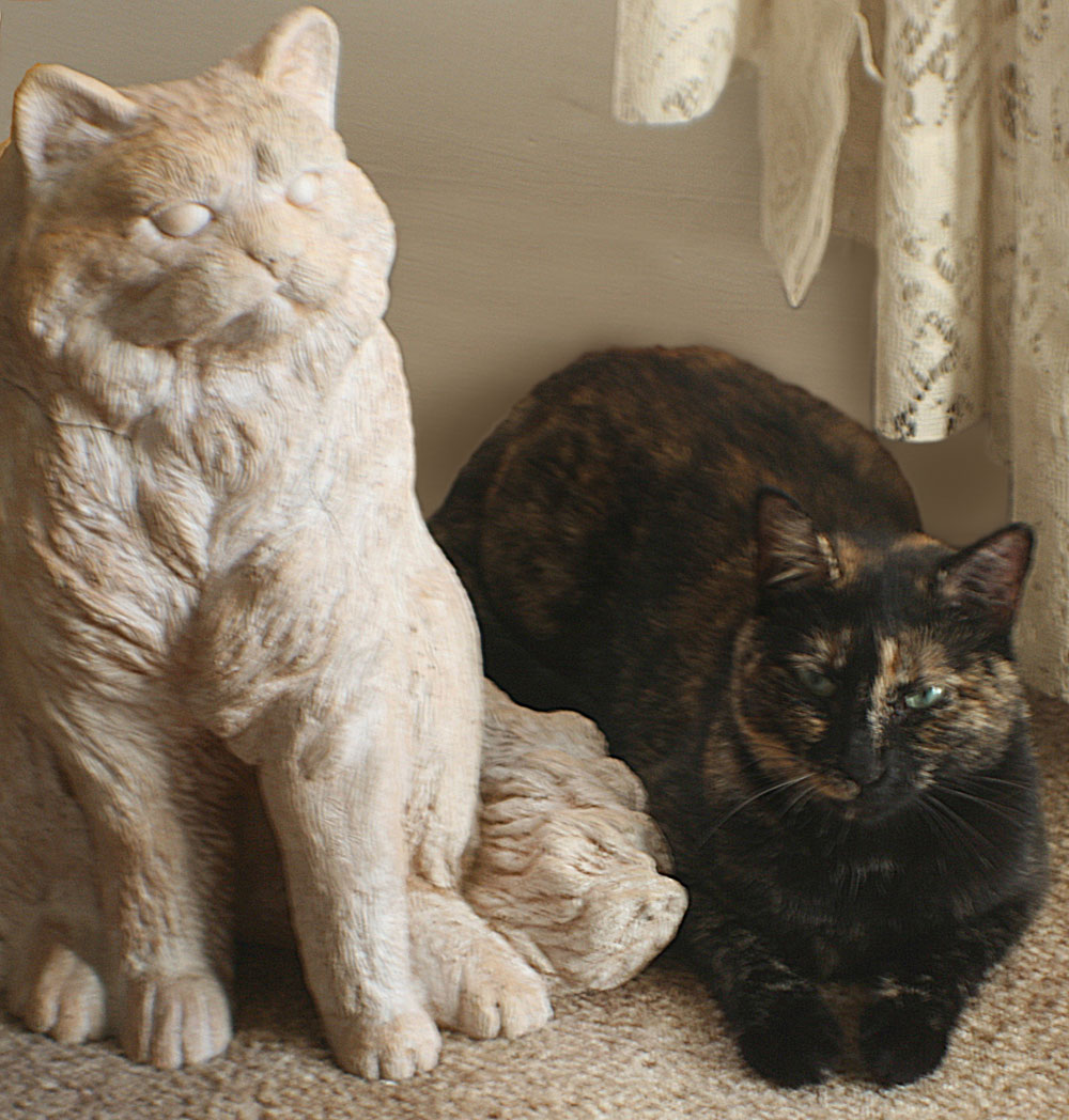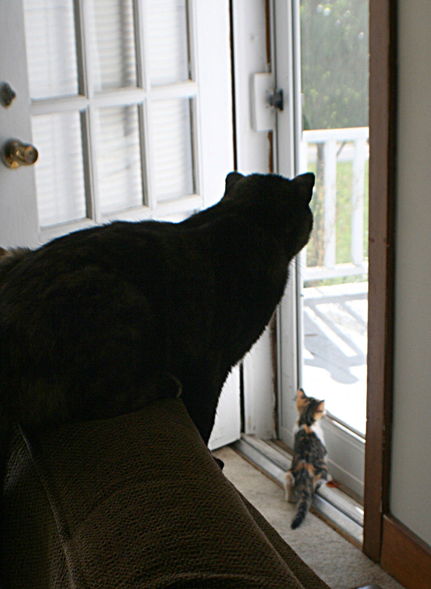 She immediately got along with Buster and plays and sleeps with him. She gets along with Sammy okay and Aiko, of course, doesn't care. Kitty-Kitty was not at all happy about the situation and was spending most of her time outside in the nice summer weather. Dewey was very curious about KK and pursued her when she was in the house. At first KK hissed and growled. Although we tried not to let them alone together, Dewey ended up with a couple claw marks before KK came around. It took awhile but now the kitties are actually playing with each other. It's frightening to watch. KK pounces on Dewey and pins her down, then they roll around on the ground, all in complete silence. Then Dewey pounces on KK. They go at it until exhausted.