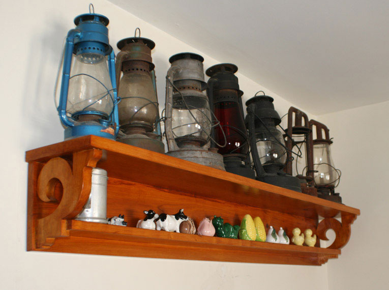 to them. As the evenings began to get colder, Danny put in a fire pit and we sat in the backyard around a big campfire. It was really pleasant. Just like camping, but with a bathroom and a soft bed. The moon was so bright we didn't get to see many stars. On a dark night here, the stars are amazing. With the onset of spring, we have used it a couple more times. On April 19 the weather was so beautiful. We sat outside after cutting firewood in the afternoon and watched all the birds. Everything is getting so green and all the trees are leafing out. You wouldn't believe all the shades of green. Then we had a fire in the fire ring in the backyard and watched the sun go down and the moon and stars. Listened to the coyotes, frogs, the whip-poor-wills and owls. This optimizes why we are here. I wish we could share it with you. :: WINTER PROJECTS The shingles went up quickly with the help of a nail gun. The metal patio roof on that side made a nice scaffold. But we ended up trashing it by walking on it and now there are a whole bunch of holes in it. The other side was not as easy. We built a small scaffold on the deck side but the other side we had to use ladders. Why does it always seem more slippery when there is nothing to stop you from sliding. The front side was more work with the gable end in the front. I was also trying to clean up mud dauber nests off the rafters and insulation. I also had to replace nasty old insulation and clean up all the dirt. It was a challenge to get the rows to line up on at the top of the gable roof and we ended up having to pull off a couple of rows. In addition, we had to tear down the old brick chimney. To save time, we got it down below the roofline and finished the rest from inside the attic after the roof was done. We finished up the front side just as the rain started coming down and it was getting cold and pretty slick. We quickly covered the peak with tar paper and put the ridge vent on a few days later after the rain let up. We finally just had new seamless gutters installed which will hopefully help keep some of the water out of the basement. We had the worst time trying to find someone to put up gutters. We called everyone within 50 miles and only one guy called us back but he never showed up. No leaks. On to the next project. We removed the wall between the living room and dining room to make more room to install the wood-burning stove. It seems kind of ironic since the wood-trimmed opening was one of the features we liked when we looked at the house, but heat takes priority and it is now easier to walk through. The existing walls are plaster over gypsum lath. There was a difference in the ceiling heights between the 2 rooms and we spend days adding more and more topping to try to hide the bumps. Looks okay in the right light, if you don't look too hard. I had an energy audit performed by the Electric Co-op. They will pay half of up to $1000 in energy improvements. There was only 6 inches of insulation in the attic, and 16 is recommended for our climate. So we bought a bunch of blow-in insulation and borrowed the blower added another 10 inches. The difference was immediately noticeable. The house stayed much warmer over night by up to 10 degrees. It was also recommended that we spray-foam the rim joists in the basements. That difference was less dramatic. Once we finally got the wood stove going the house was actually too hot, especially at night. By the time we got everything done, winter was almost over. We used all of our firewood that we had cut plus we had to buy 2 more truckloads. Most of it went to heat the shop since it only has a wood stove and the house has a gas furnace. We have already started cutting firewood for next winter. When we cleaned the pasture, we got a big pile of old fence posts to cut up. Danny spent the rest of the winter in the shop working on projects. First, he built a custom cherry bookcase for a co-worker as an xmas gift for his wife. He finished it just in time. Next he built the rest of the doors for the barn. We finally got them up in March. It is so nice to have doors that open and close. It took all my strength to open and close it and part of the old door had completely broken off. There was one point during the winter when the ground had expanded under both doors and the only way in and out was through the little side door. After the doors were finished Danny returned to a pet project he had started earlier. He customized a design for a Purple Martin house that he found on-line. Using a plywood framework, he added siding, mock windows, porches and shingles. It ended up weighing over 50 lbs. It was a challenge getting it up on the post in the backyard. Harder still is keeping the starlings out. Danny has to get the tractor out and our tallest ladder to reach it and pull the nesting material out. We were so happy to see Martins come to check it out but they haven't stuck around. It looks like we will be forced to trap and "dispatch" the Starlings before the Martins will stay. I made a trap but they haven't fallen for it yet. Earlier, we had one fall down each of the stove flues into the stoves. I'm sorry now that we set them free. My little winter projects include restoring an old electric fan that we got at an auction for $5. It was from an auto shop and absolutely filthy but functional. I looked up old fans and this one is post-war and not that collectible but I like the looks of it and it should come in handy. In February, I finally put up shelves in by office closet and organized that mess. Then I made a simple cherry wall shelf for my lantern collection that has been sitting on the floor for 2 years. Amazing how long it takes to unpack and really get moved in. I finally started welding. Just a little project to start, but it is taking forever. We finally got a torch set-up on Craig's List after having been repeatedly outbid at auctions for the last 2 years. Now I just have to figure out how to use it. Danny w