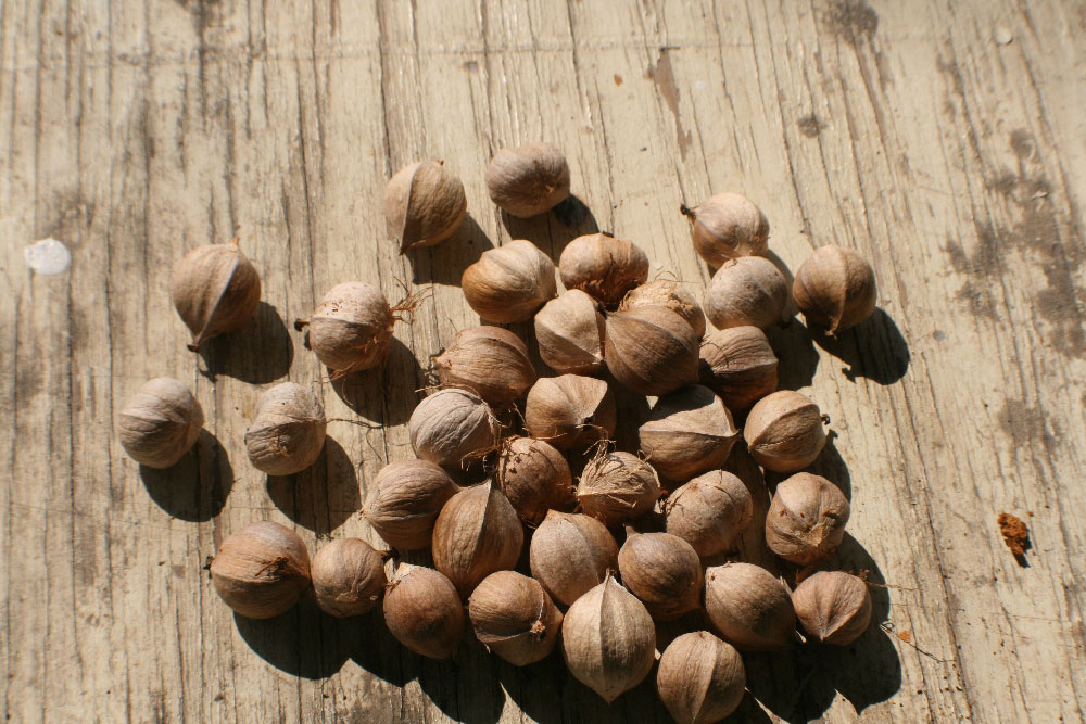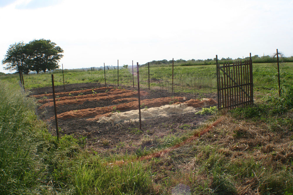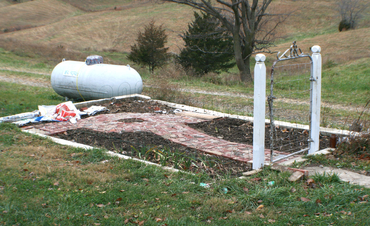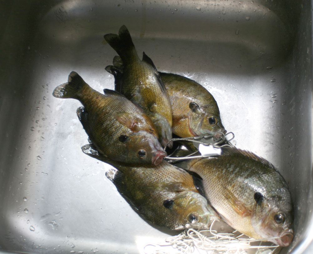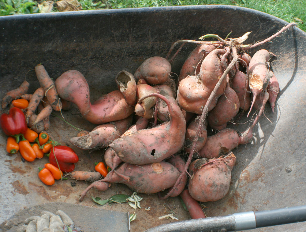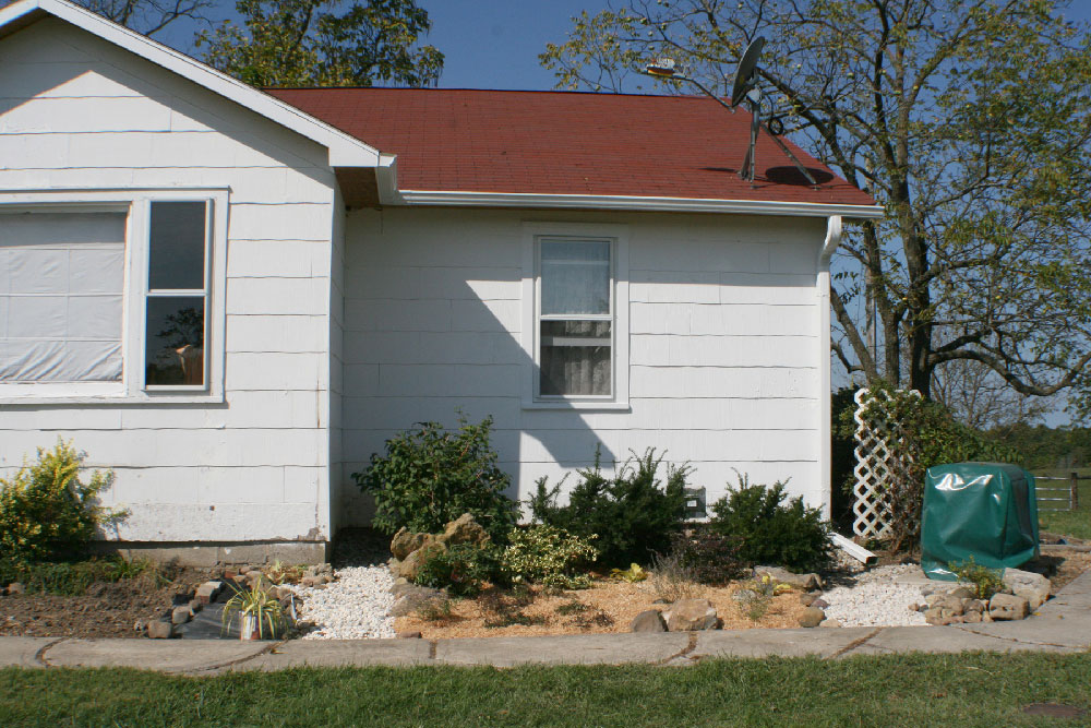 to them. :: WEATHER :: PROJECTS Starting on the South side I worked my way around the house. I worked on the sashes in the shop and I waited until the side I was working on was in the shade to reinstall and paint.It slowed me down but gave me an excuse not to work. The north side was in shade all day, and the back is covered by the porch. The window on the front in the dining room was a challenge. It is off the front deck, which is nice because I didn't have to use ladders, but there was a barn swallow nest over the front door (again this year). The swallows dive-bombed me while I worked for short stints. I worried that they might abandon the nest. As I worked, I watched the baby sicking his head over the edge, keeping an eye on me. The baby fledged the day after I finished working out there. The big front picture window was a daunting task. The bottom edge of the frame on the picture window was completely rotted away. We bought a special router bit and Danny made a new frame for it, as well as sashes for the side windows and several other windows around the house. When we finally tackled removing the front picture window in October, we were so worried we were going to break it. We were able to get it out and into the new frame without disaster. It was 1/4" glass--very heavy! I made the mistake of putting it in the frame while it was flat on the shop table. When we turned it vertically to put it back in, the glass slipped down and all the glazing compound buckled. It could have been worse--I wiped it out and did it again. Fortunately, we found less rot in the opening than we feared and we got all the sashes back in that same day. It took until the end of October to get the last window finished.The last job was putting weatherstripping, polyurethane, and sash locks and lifts on every window. It's so nice to have them looking better and particularly nice to have windows that open and close properly. Alas, I am afraid they are going to be just as drafty. One recent windy day, I could still feeling cold air coming in from the bedroom window. For a winter project, we are going to change out some of the moldings on the inside. We have already done the big front window and front door. We salvaged some old moldings from a friend's old abandoned house and recreated the style. I love the way it looks so much more than what was on our house originally. The beautiful window draws my eye away from my TV watching. I can't wait to do the rest of the house. But I will hate to cover them up with curtains. :: GARDEN By late August the weather cooled down to comfortable mid-80s. The garden was already starting to wind down. The tomatoes were only beginning to turn red. They weren't as good this year. I got a variety called Jet that is supposed to be less acid and good for slicing, but they just don't taste as good. I tired a different variety of green beans too that didn't fair well. Plus lima beans that just didn't put out much. The cucumbers were slowing down--they got too hot this year and were often bitter. The zucs and squash plants died off early. Probably because of the squash bugs.. The melons were mostly done. The cantaloupes were really good this year. I got so many I cut a bunch up and froze them and used them in my morning smoothies.Yum! At one point, I had 2 grocery bags of cucs going bad in the frig. The eggplants didn't get bigger than softball size but I used most of them. I started harvesting the sweet potatoes. They look pretty funny and I had to share them with some type of critter, but they taste good. Danny won't eat half of the produce, so I have to eat it all myself. I had to get creative with recipes. I made 2 batches of Ratatouille and found some fun sweet potato recipes. Unfortunately, I didn't get around to making pickles this year. The bell peppers were the last thing to come in. I had an unusual sweet orange bell that was about the size of jalapenos and they produced early and plentifully (they are in the picture with the sweet potatoes). :: YARD This September, I revamped the front planting bed. There were a couple foundation plants there already and grass that never got mowed because it is on the wrong side of the walkway. I had a vague idea of what I wanted to do and I bought a bunch of plants on sale at Lowes. Because I didn't plan it well, I had 6 plants left over to find homes for. If I have a plant in a pot it will die on me in no time so I needed to get them in the ground. The 4 spirea will become a screen around the air conditioner unit. The other 2 we won't talk about. The irises in the backyard are a continuing issue. Danny doesn't want to mow around them and there were far too many for me to keep weeded. We finally figured out a place to move some of them to. We were trying to decide what to do with the foundation from the shed which is still in the backyard. The dirt inside the walls will define a nice planting bed. I started to dig up irises to move there in the Spring. I didn't get very far before it got too hot to work. I had to clean out all the weeds and I planted a handful before other projects and the heat stopped me. The others sat in a bucket all summer. By fall, only a few were useable. And, I had a new crop of 6 foot tall weeds. After I got it clean-up again (with help from the chickens), I laid the path. I got what I could planted but the chickens keep coming in and scratching it all up. I put the gate in place as a focal point. It came from the fence down hill from it. We didn't want to put up a fence because it will block the view of the garden and hills beyond. I made a plan for a fence but we haven't had time to put it up. Next year, I will try again and I am planning to put in a birdbath/sculpture thingy and a bench. :: FISHING Then we paddled around on our upper (smaller) pond. We fixed it up last fall and it had filled to capacity by early spring. A couple revolutions and we were at the far side. I wanted to know how deep it was since we stocked 