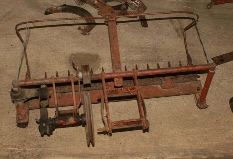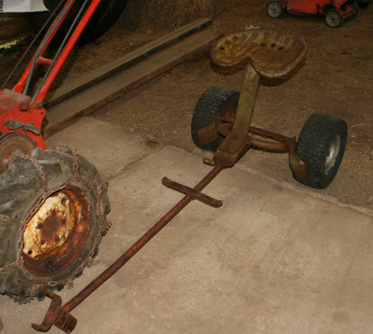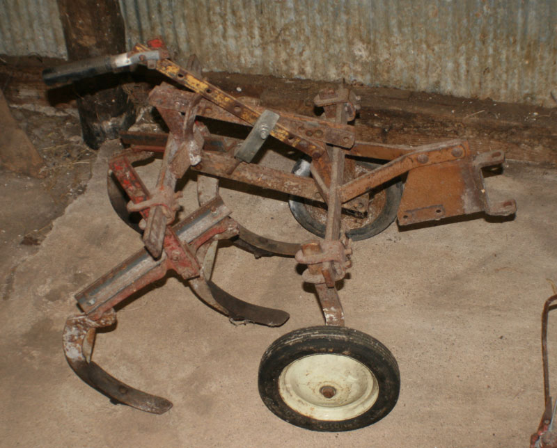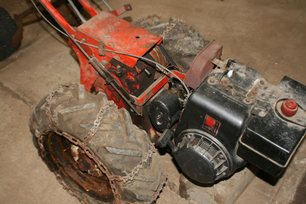 At the end of the summer Danny let me go to an auction alone. I was pretty good until bidding started on an item I hadn't even noticed. I was in the market for a rototiller but this item intrigued me because it had several attachments. I won the bidding and imediatelyworried that I had just paid $60 for a bunch of old scrap metal. Most of the smaller images :: WALKING GARDEN TRACTOR We tried to get the engine running. We removed and cleaned up the carb. We were able to run it for a few seconds before it died. We decided it would run with some adjusting and tuning, so we removed the engine and took the whole tractor entirely apart and opened the gear box. I was most concerned about the gear shifter. It hadn't been used for so long, it didn't want to go into gear. Once it was open, we were able to get the shifter to move and everything looked good inside. We ordered new seals for it and waited a couple weeks for the parts to come. Then closed it up and I went to work cleaning it up and painting everything. We had some old tractor paint that had been left behind in the basement. I hated to change the color from the original orange, but I also hated to buy new paint and let the old paint go to waste. The tires and wheels on it were shot so I looked on ebay and craigslist for some inexpensive replacements. I bought a pair of wheels on ebay that cost $25 but the shipping was another $25. I priced new tires to put on them, but they would run between $100 and $150 for the pair so I kept looking. I put an ad on Craiglist. A guy offered me an old pair of tires and wheels for $25. They are not pretty, but they are holding air. If they last this season it will be worth it. I started cleaning up the old Tecumseh engine. The plastic cooling fan had caught on something and gotten torn apart. It was a challenge getting the flywheel off with a makeshift wheel puller made out of some bolts and metal scrap from the barn. Once that was off we decided to replace the points and condenser. Another delay, as I waited for the parts to come. That meant having to re-time it and since we didn't have the specialty tools, we took off the cylinder head, that meant getting a new head gasket. I impatiently waited a week for the part to come in the mail. I put the engine back together, put it and the wheels on the tractor. With a litte ether, we are able to get the engine running. Danny put it in gear and it took off. We still have a few adjust ments to make but I can hardly wait to see what it does in the garden.